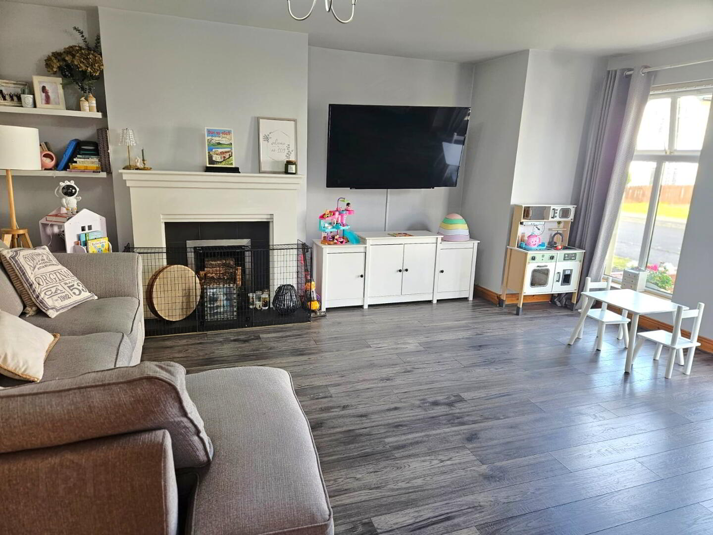 Feature open fire with tiled hearth. TV points, laminate wooden floor and bay window which allows light to flood the room.