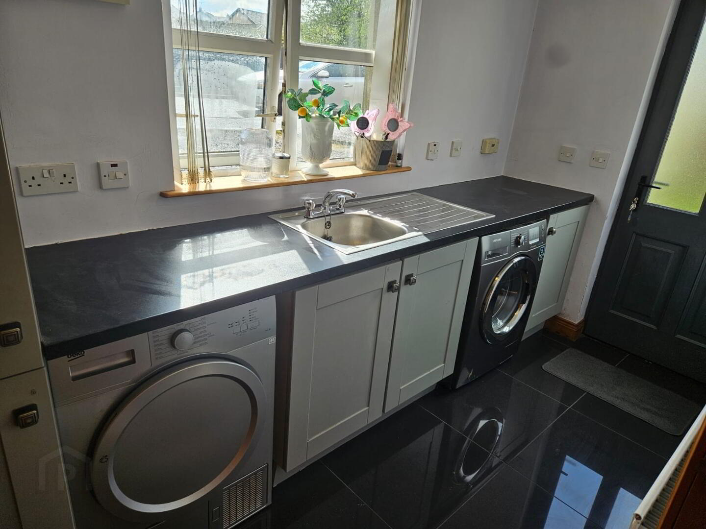 Range of low level kitchen units and larder style units, stainless steel single drainer sink with mixer taps, plumbed for washing machine. Tiled splash back and tiled floor, ‘Samsung’ washing machine.