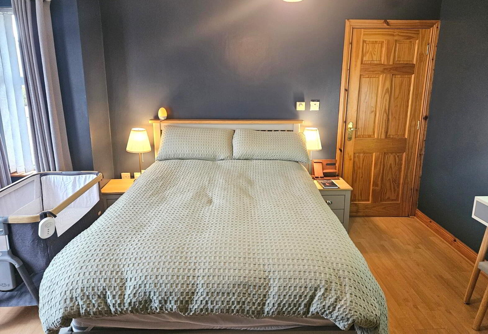 Laminate oak flooring, vertical blinds.