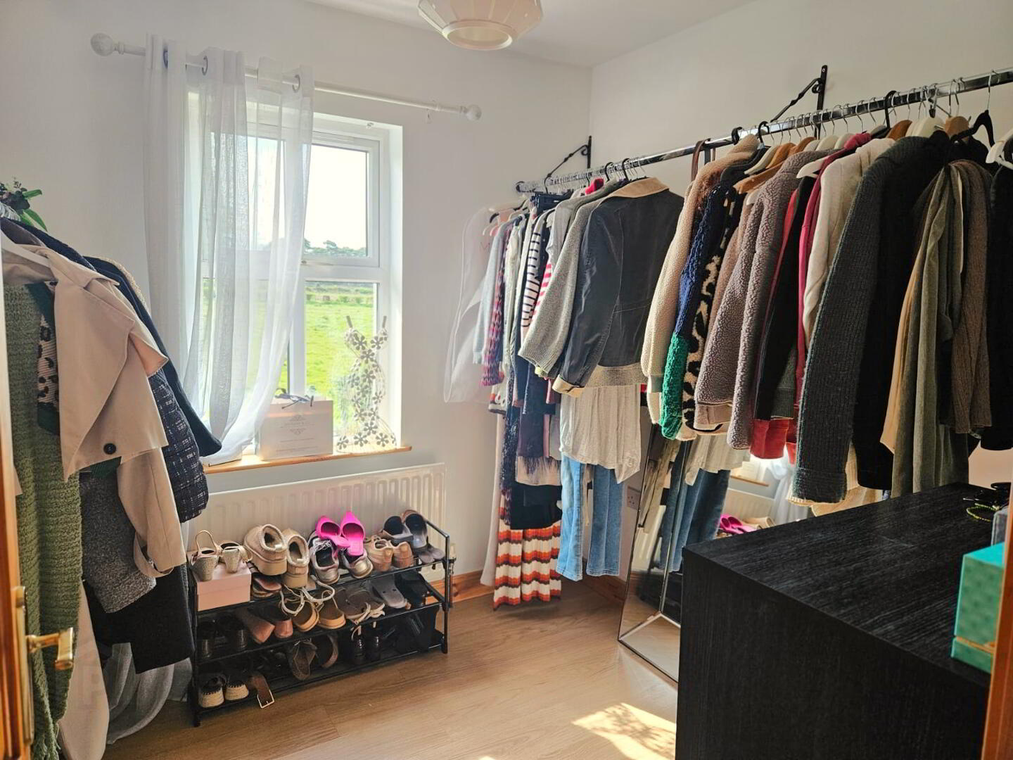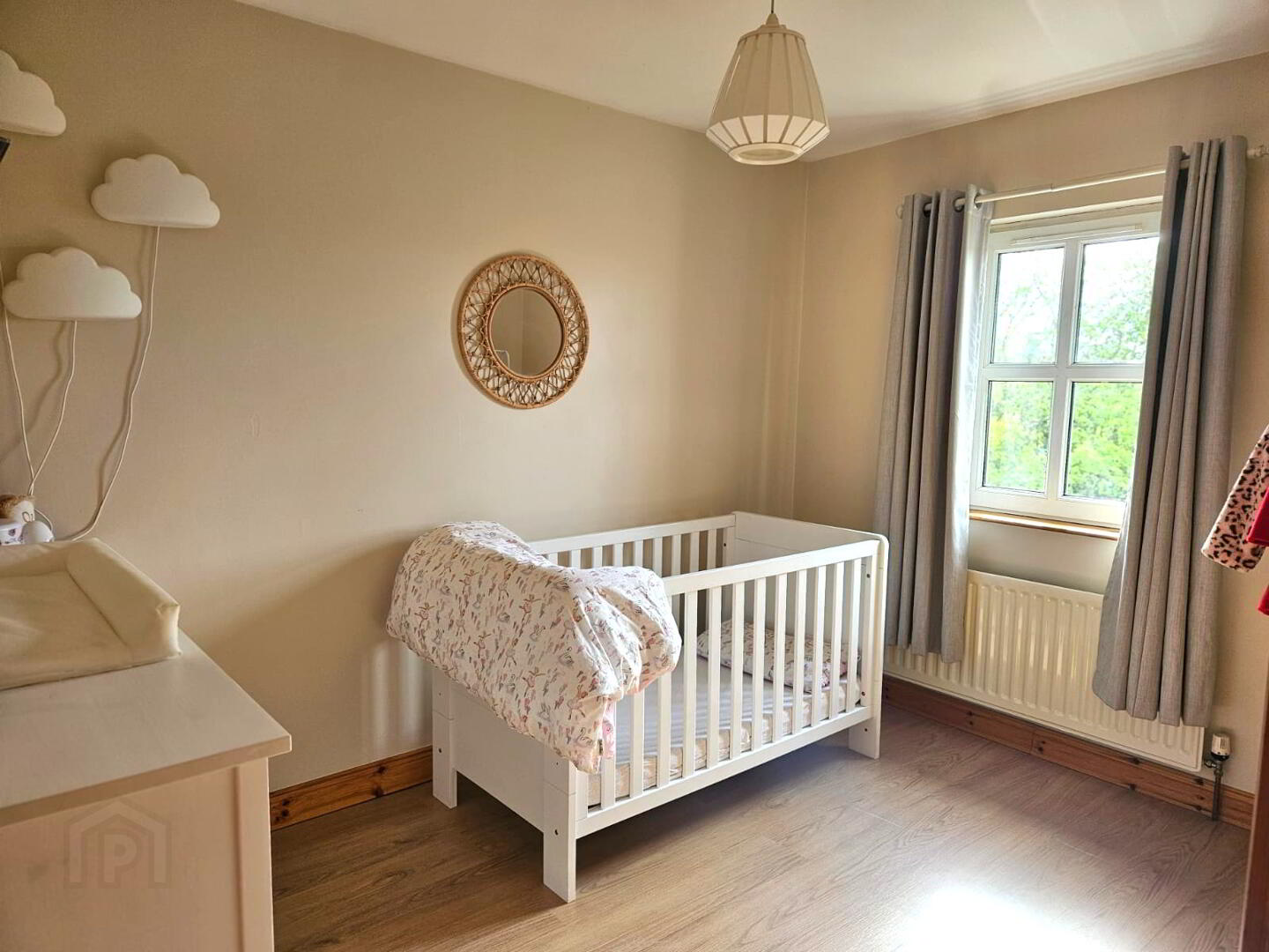 Laminate wooden floor, curtains.