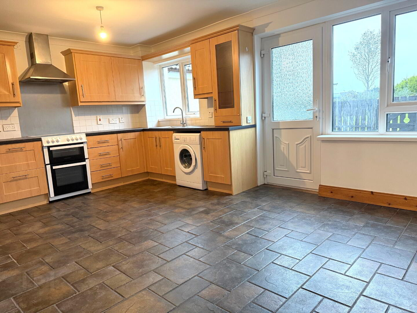 Kitchen/Dining Area: 17’6’’ x 11’4’’ Excellent range of eye and low level fitted kitchen units in a ‘Shaker’ style finish incorporating 1 1/2 bowl stainless steel sink with mixer taps, 4 ring electric freestanding cooker, ‘Beko’ washing machine, walls tiled between kitchen units, floor tiled, uPVC back door, storage under stairs, coving to ceiling.