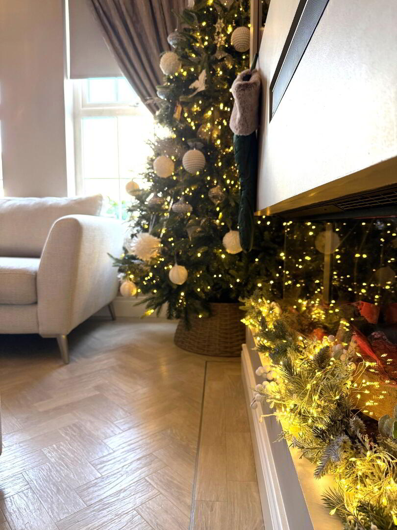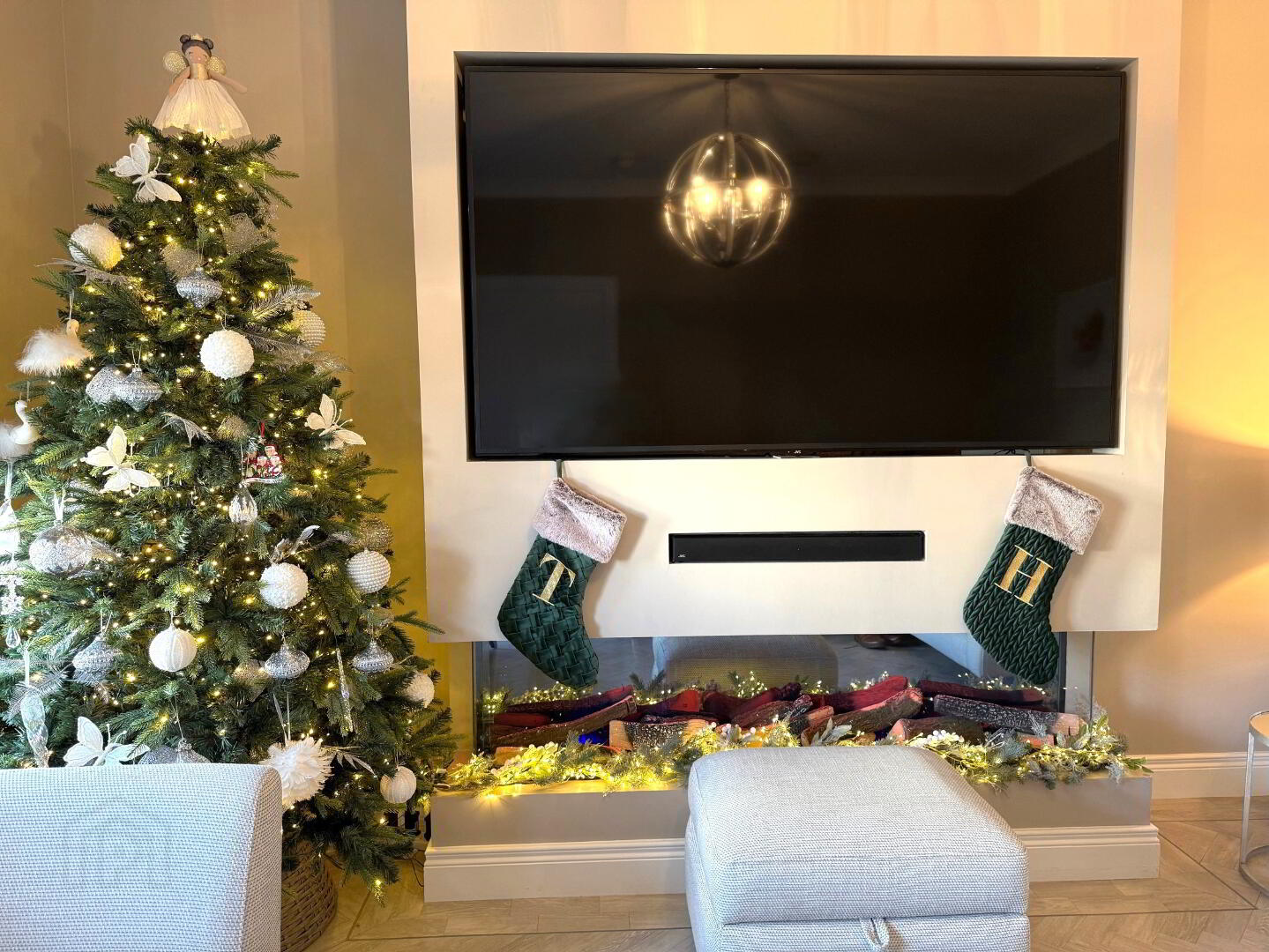 Living Room: 13'4'' x 12' 2'' Feature media wall with 75’’ JVC wall mounted TV and sound bar, beautiful