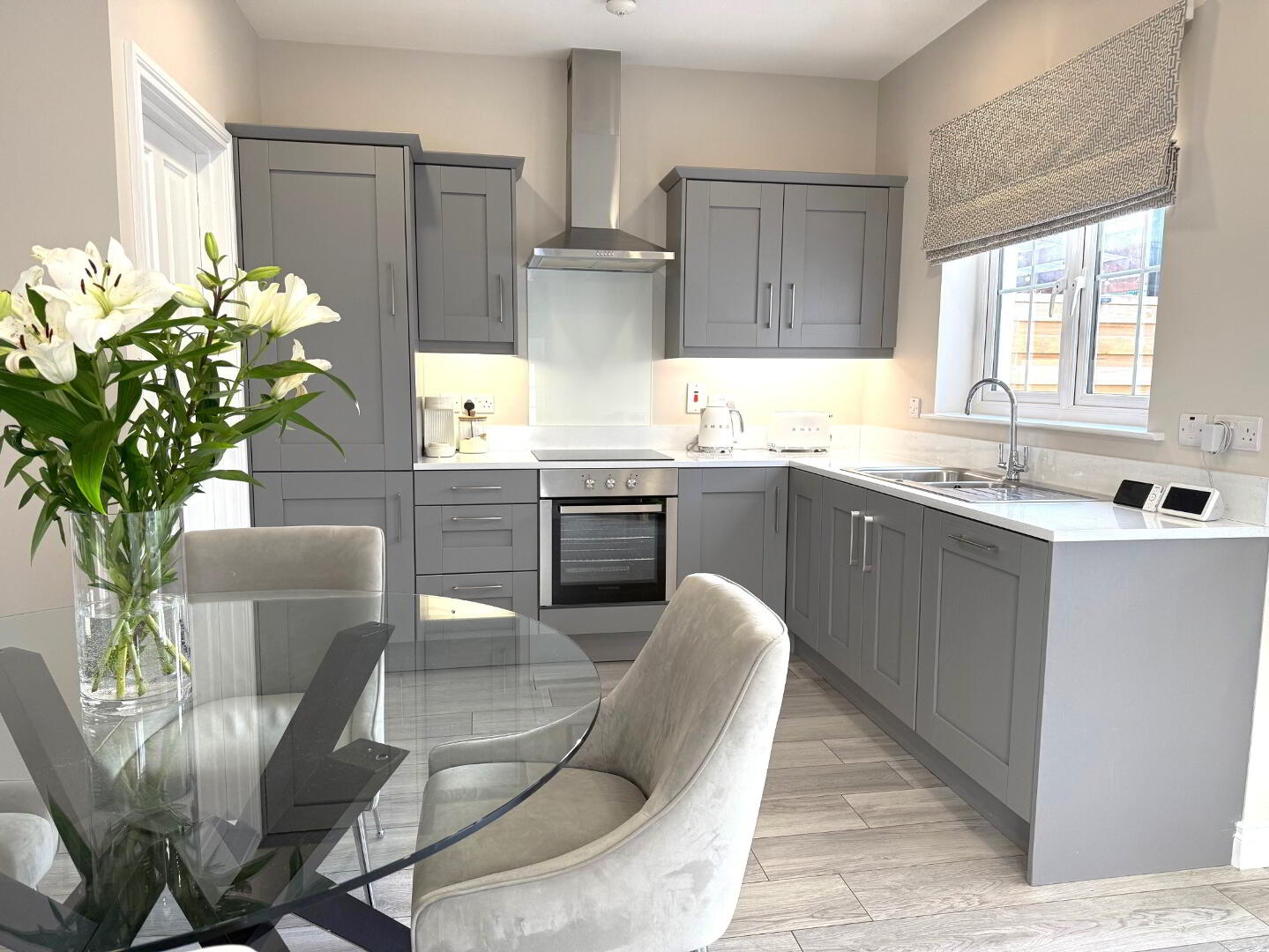 and lighting, laminate wooden floor. Range of fitted units and work top area, ‘HotPoint’ tumble