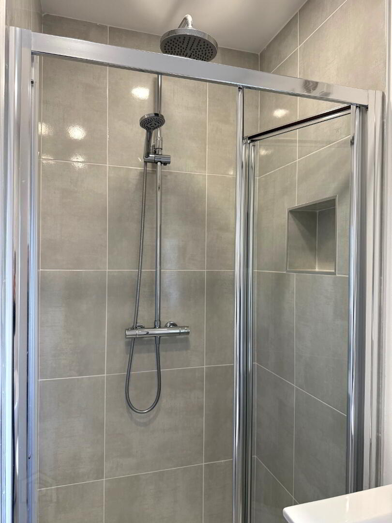 door, walls part tiled and floor tiled, LED Bluetooth mirror.