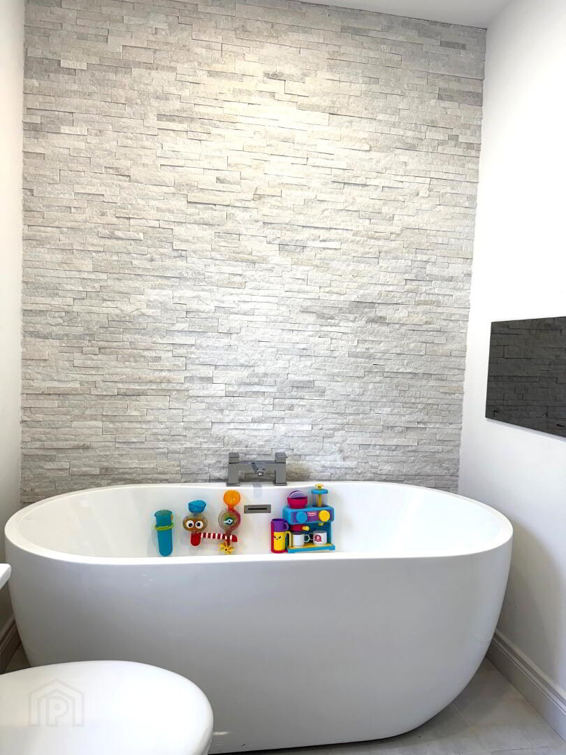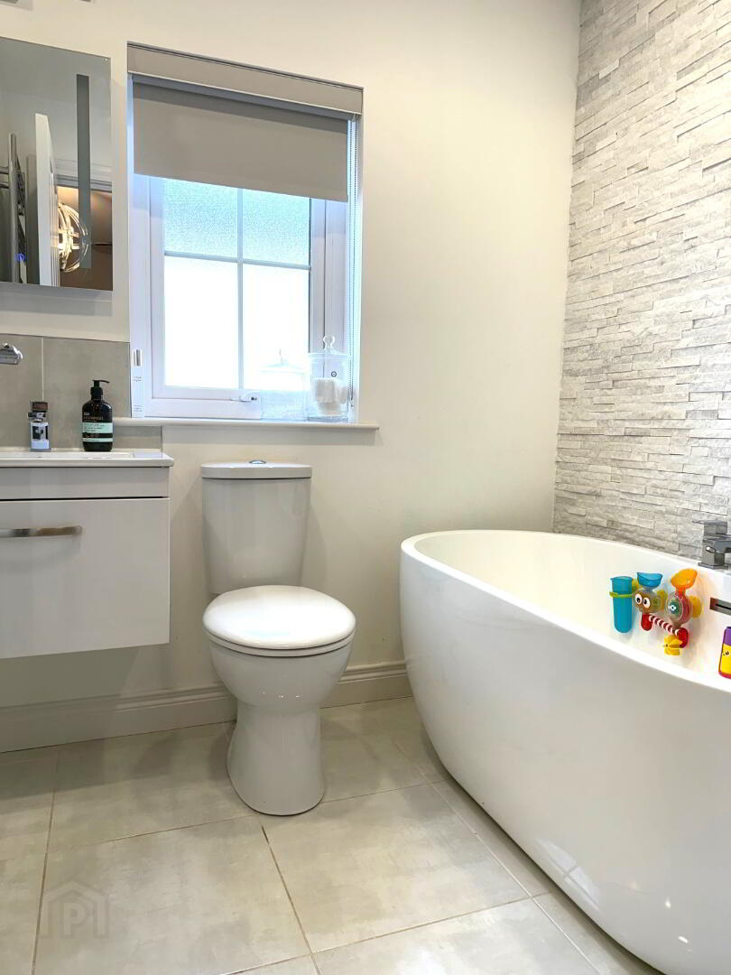 Bathroom: Suite includes low flush wc, free standing contemporary bath with mixer taps, wash