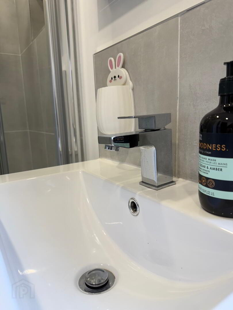 hand basin with floating vanity unit, heated towel rail, mains power shower with glazed bi-fold
