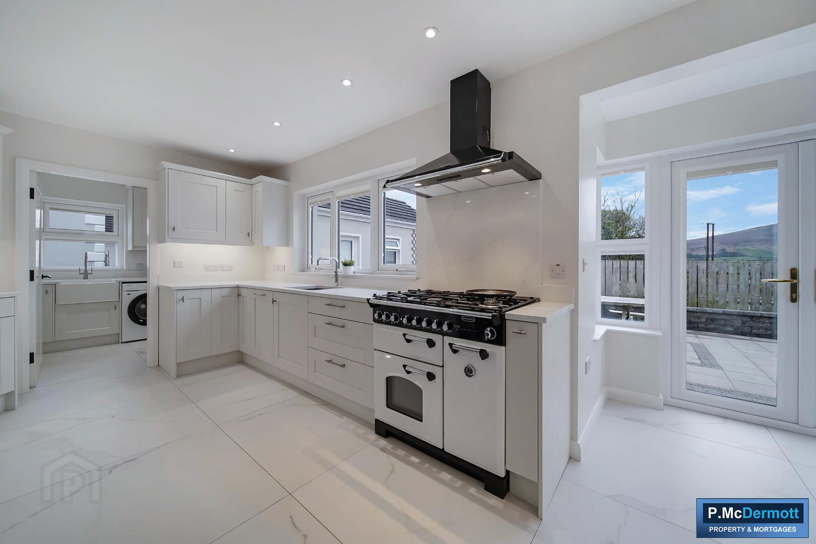 Fitted with additional storage units, quartz worktop and Belfast sink, with tiled flooring and uPVC rear access door.