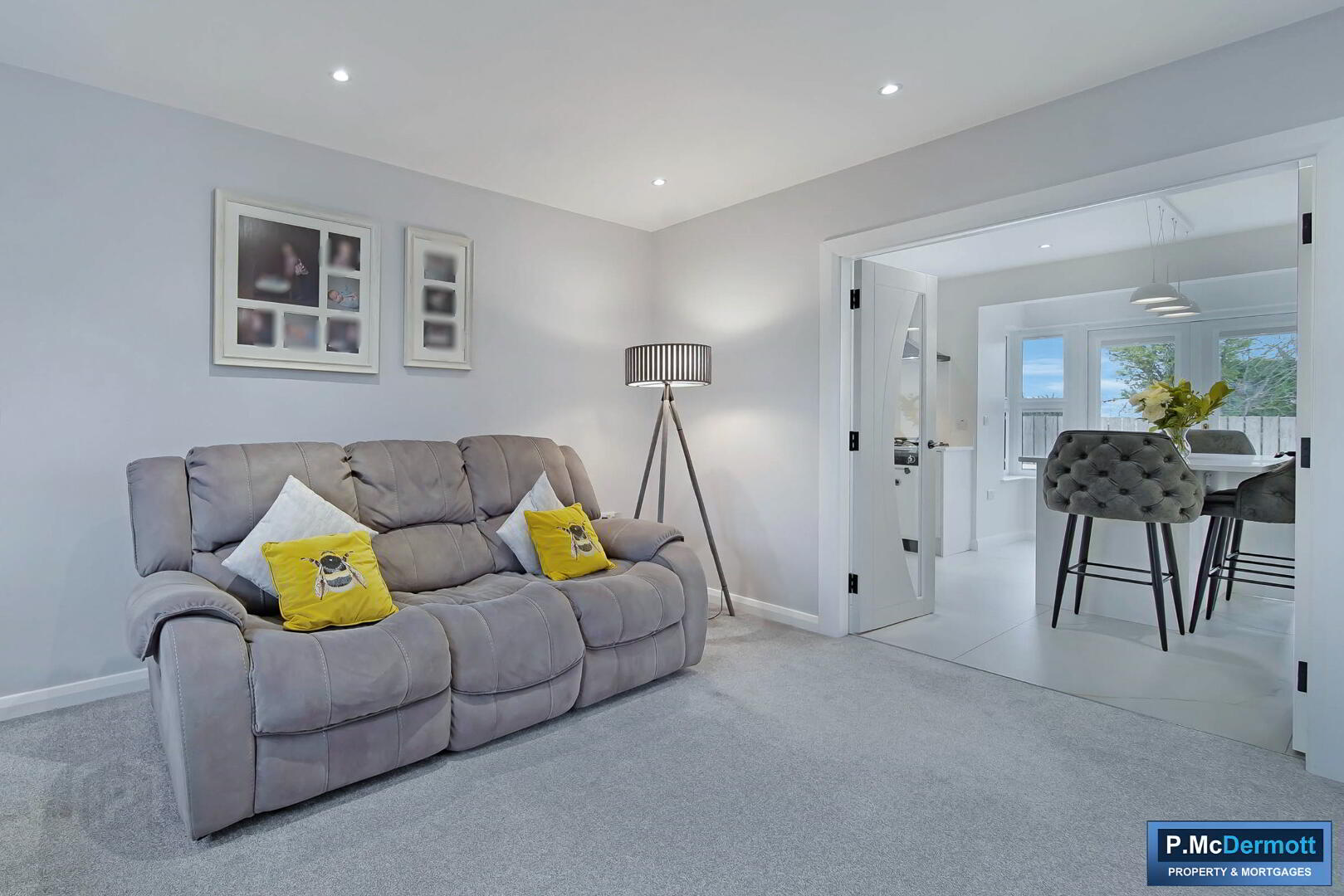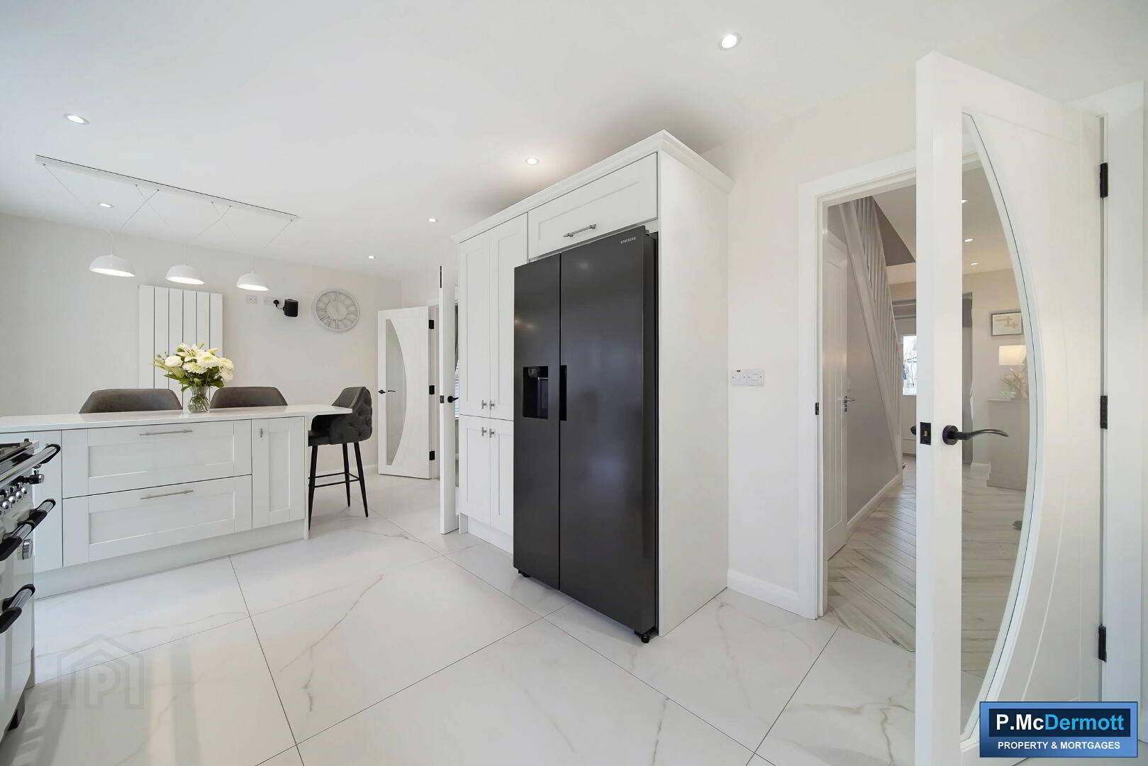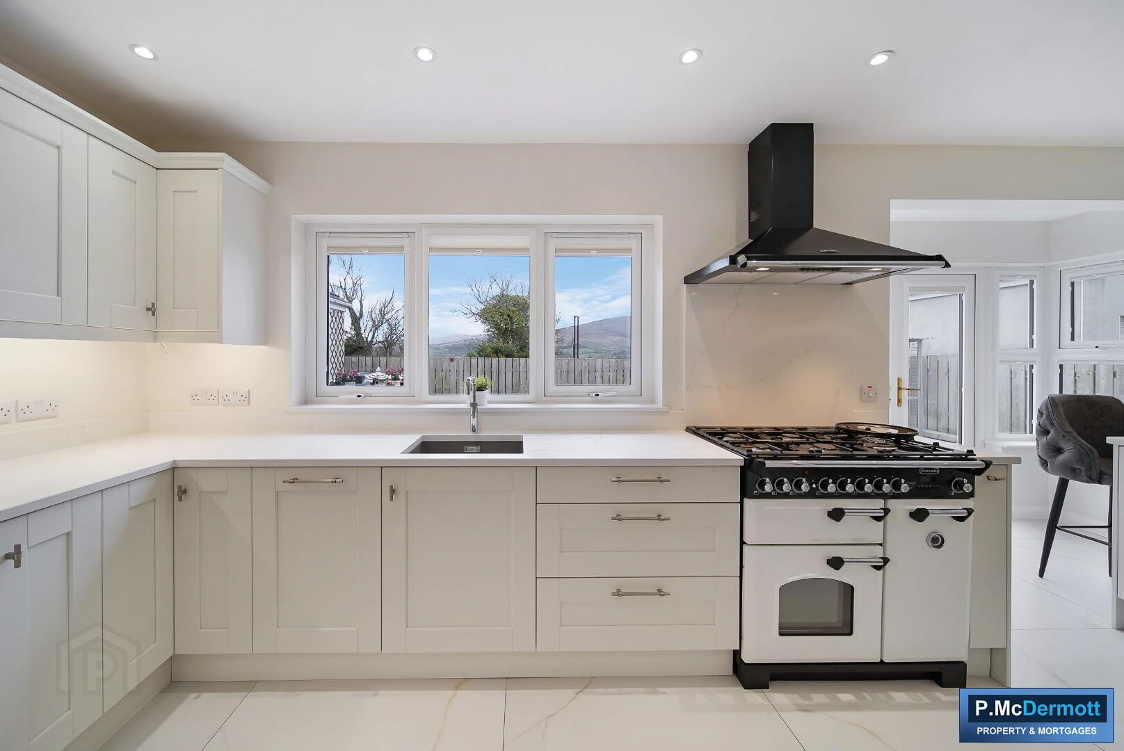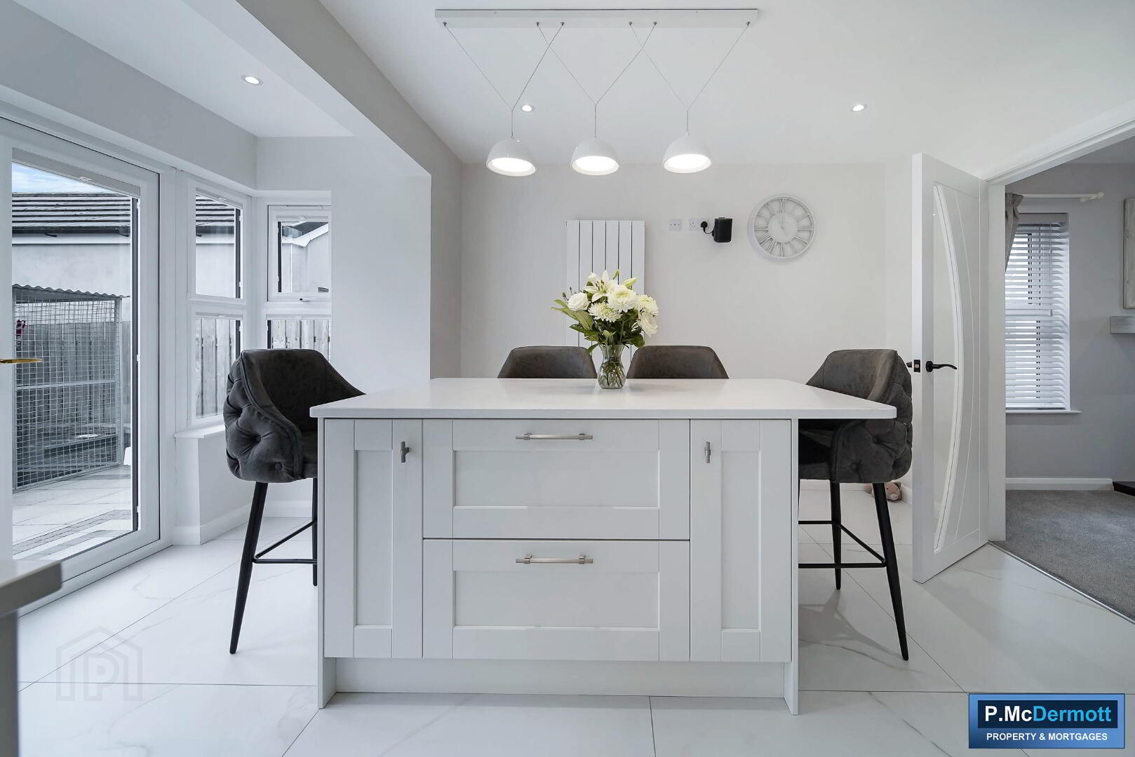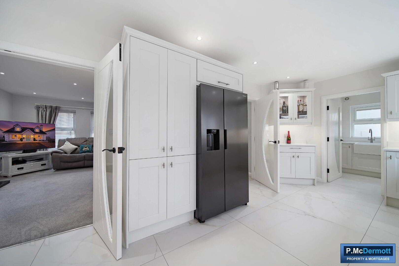 A central island with additional storage and integrated charging points enhances both practicality and style. Tiled flooring runs throughout, with patio doors leading to the south-facing rear patio and French doors connecting to the living room. Recessed lighting completes this outstanding space.