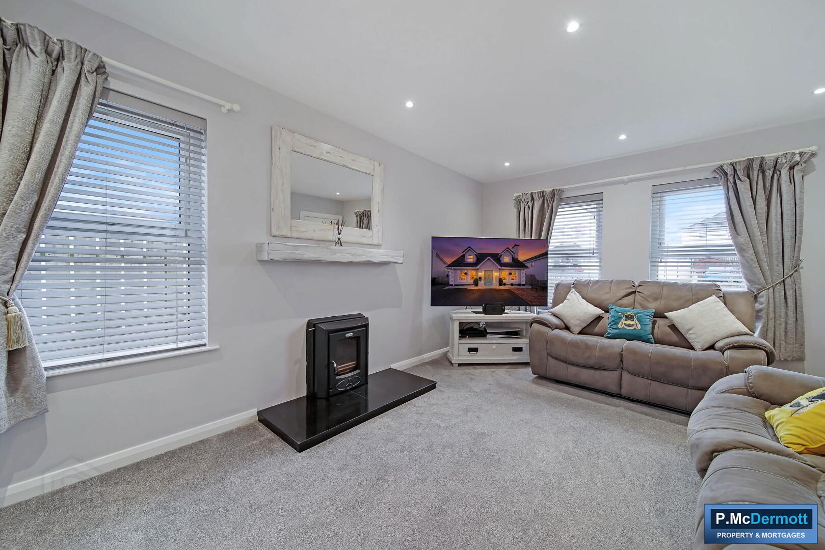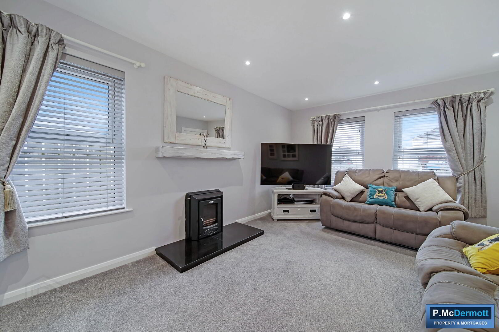 A spacious main living area centred around a feature wood-burning stove with back boiler and granite hearth, creating a warm and inviting atmosphere. Carpet flooring and recessed downlighting complete the space.