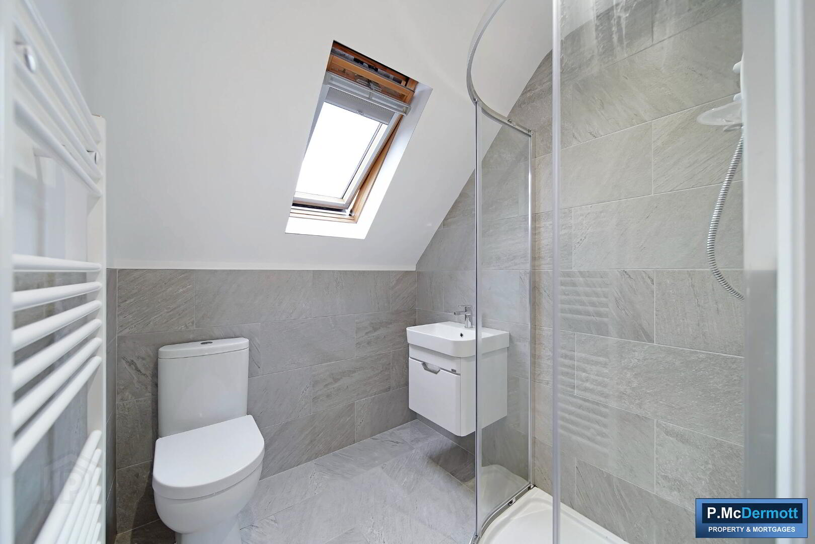 Fully tiled and comprising low flush WC, pedestal wash hand basin with floating vanity unit, heated towel rail and electric shower within glazed enclosure.