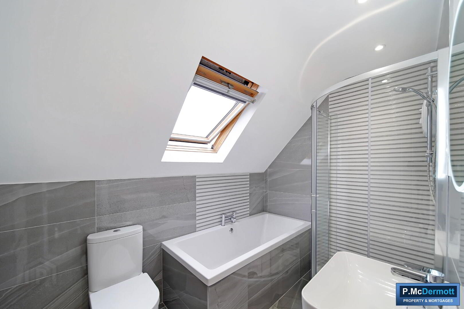 Modern suite including bath with mixer taps, wash hand basin with floating vanity unit, low flush WC and electric shower with glazed enclosure. Fully tiled with LED wall mirror and recessed lighting.
