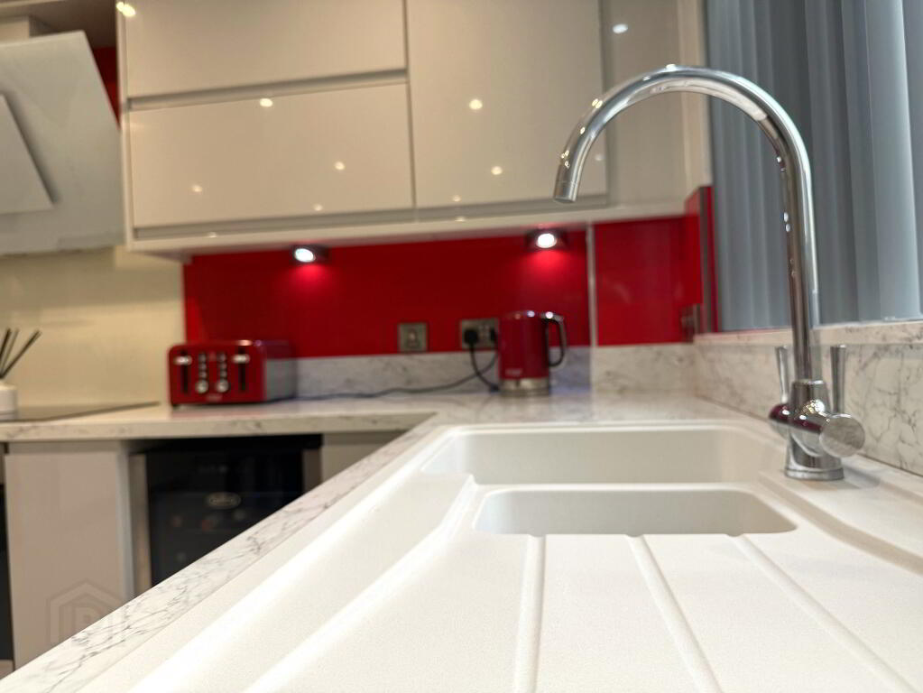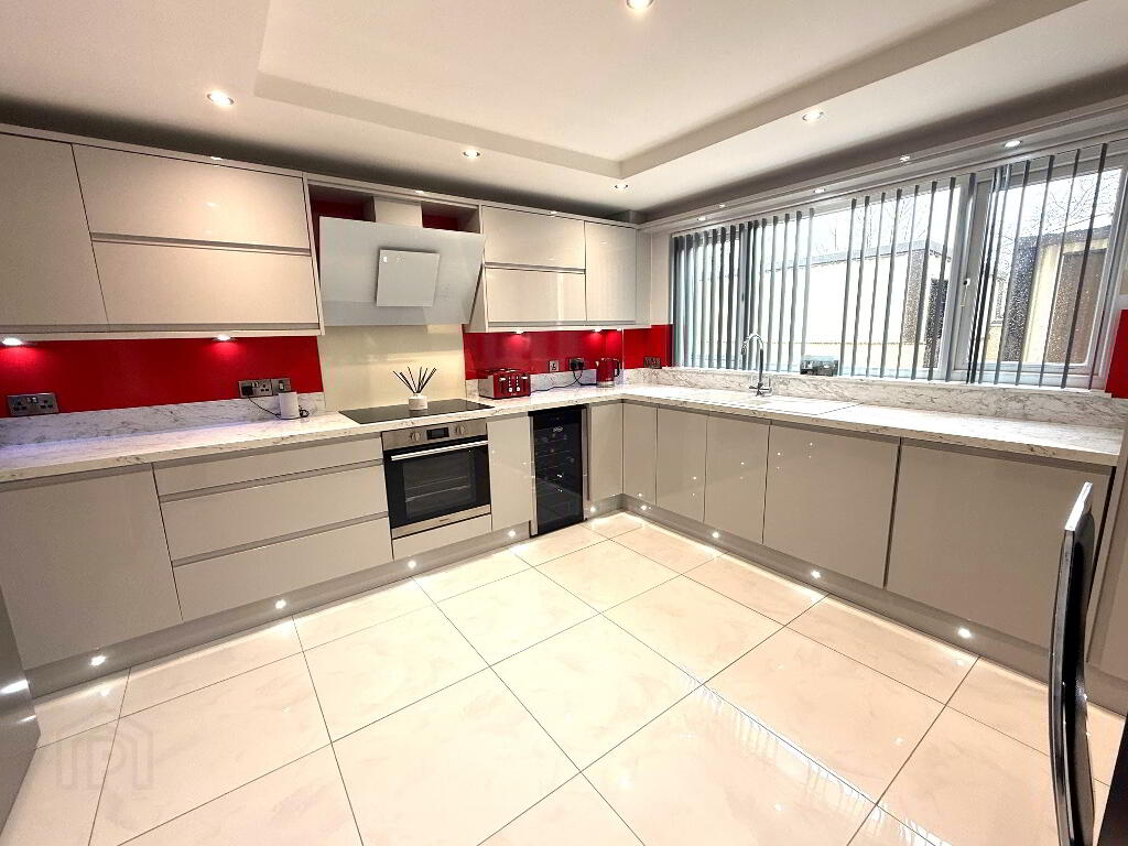 Kitchen/Dining Area: 17’7’’ x 11’4’’ Fantastic range of eye and low level fitted kitchen units in a modern contemporary style finish incorporating ‘Blanco’ 1.5 bowl sink with mixer taps, ‘Hotpoint’ electric hob & ‘Hotpoint’ electric oven, ‘Hotpoint’ integrated dishwasher, ‘Belling’ American style fridge freezer. Coloured composite splashback between kitchen units, downlights to ceiling, porcelain tiles to floor, t.v. points, uPVC back door.