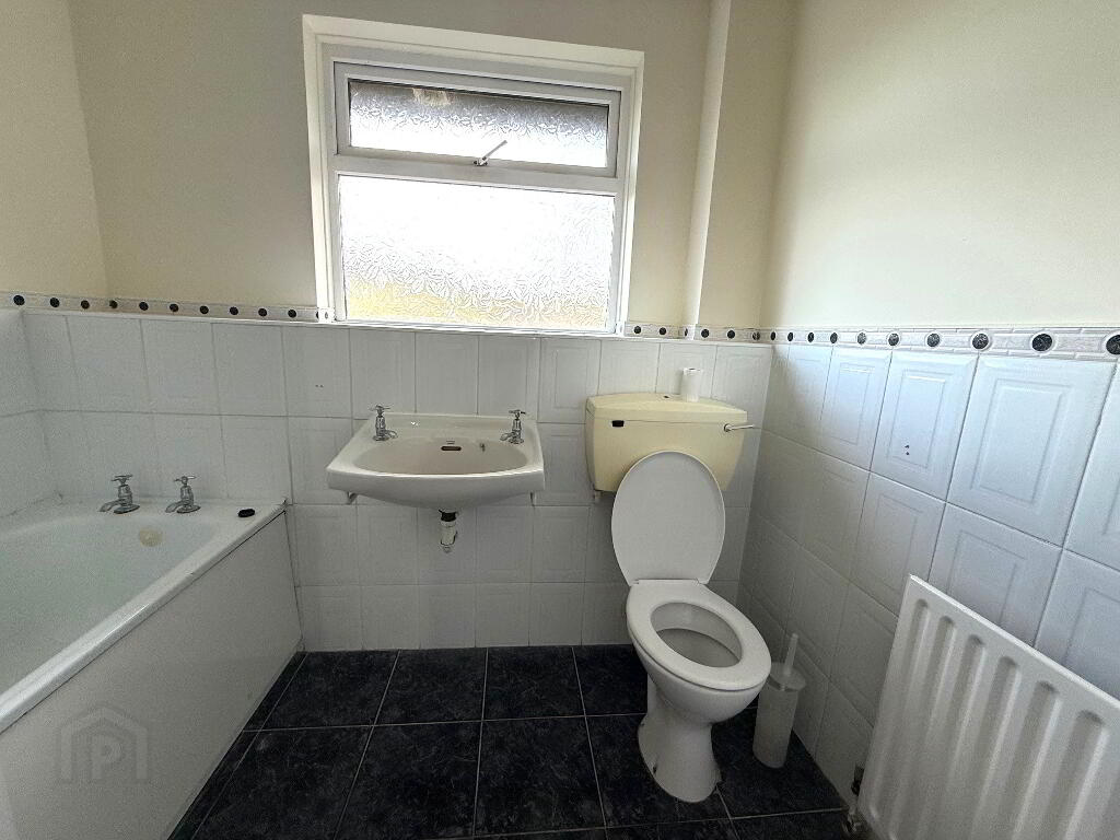 Bathroom: 7’8 x 5’6 Suite includes low flush wc, wash hand basin, bath with electric shower and glazed shower screen, walls part tiled and floor tiled.