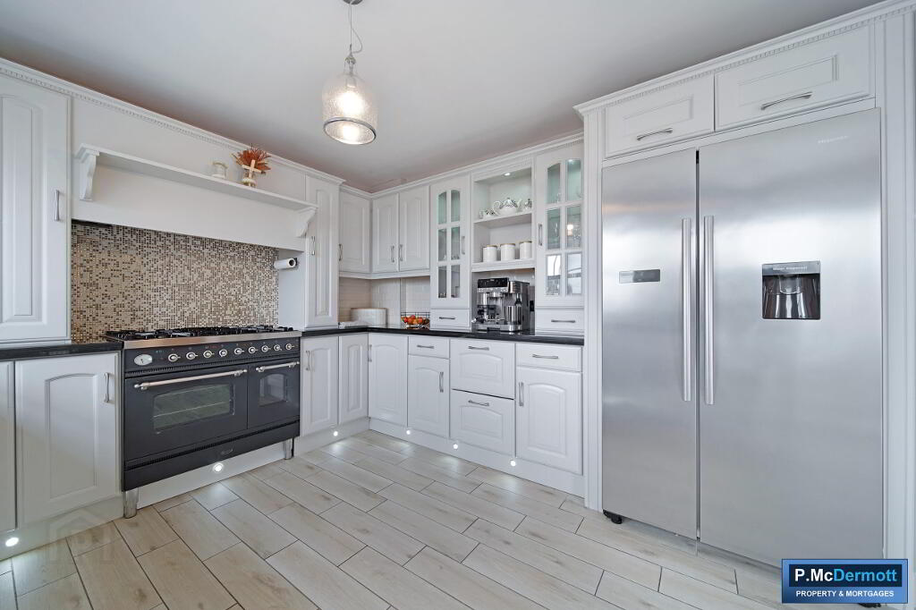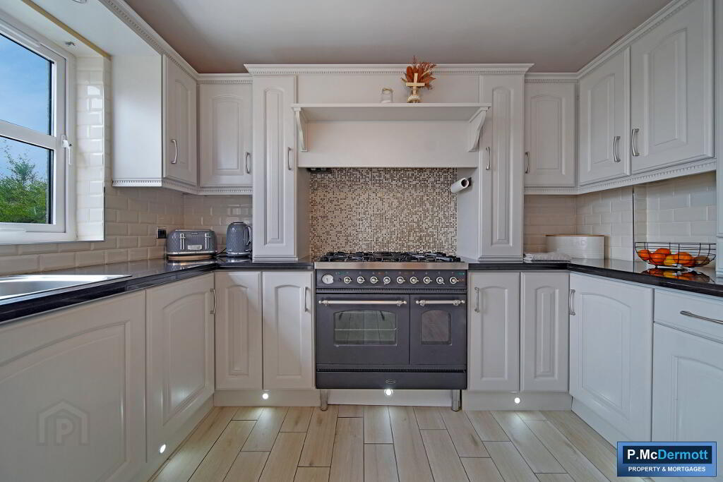 Excellent range or eye and low level fitted kitchen in a modern contemporary style finish, walls tiled between kitchen units, floor tiled. Patio doors leading to rear garden area, 5 ring gas range with electric double oven, ‘Hisense’ American style fridge-freezer, ‘Hotpoint’ washing machine, low level lighting to kitchen units, high level TV points.