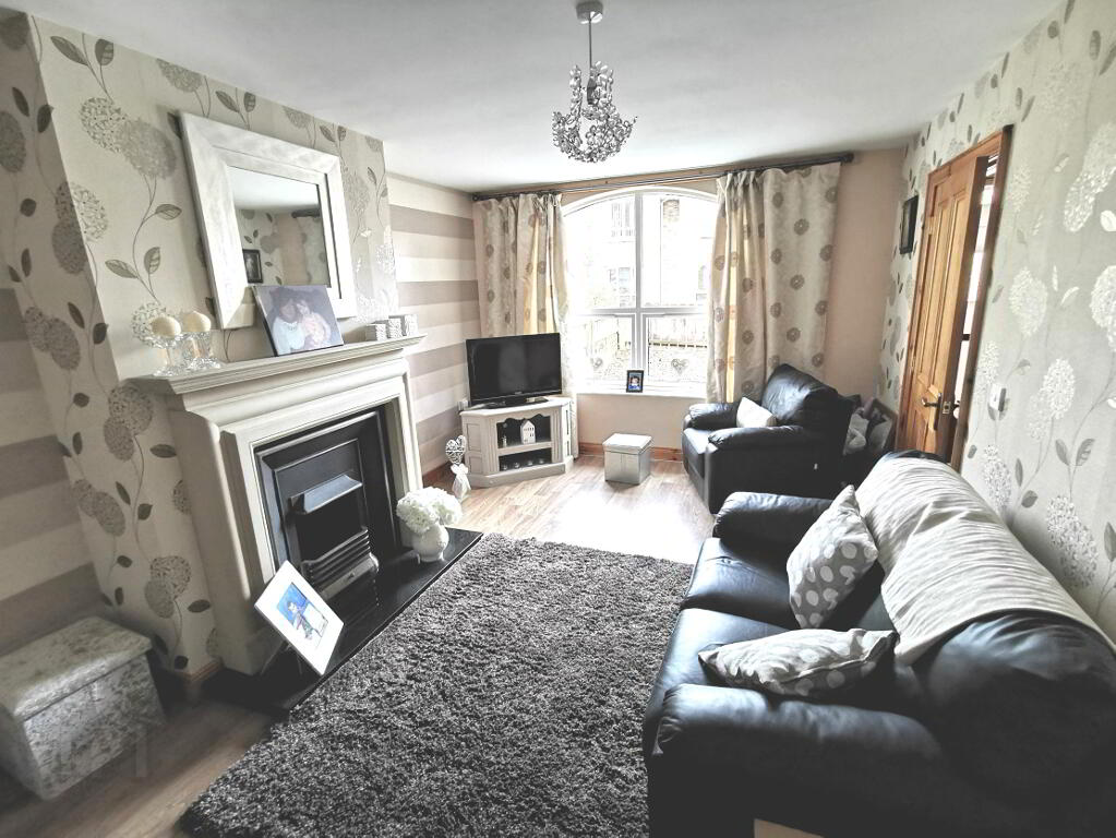 Living Room: 17’3 x 10’11 Feature open fire with cast iron inset and tiled hearth. TV points, laminate wooden floor.
