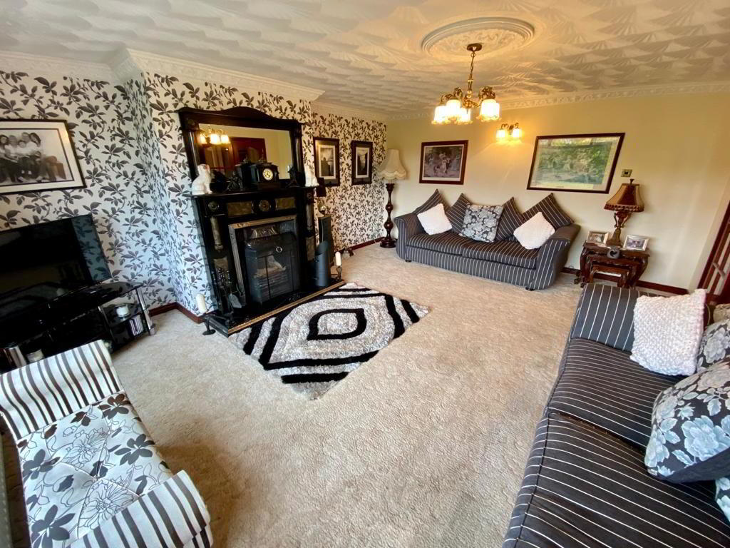 Living Room: 19’2 x 14’9 Double french doors leading from entrance hall. Feature open fire with ornate surround and matching over-mantle, tiled hearth. TV point, carpet to floor.